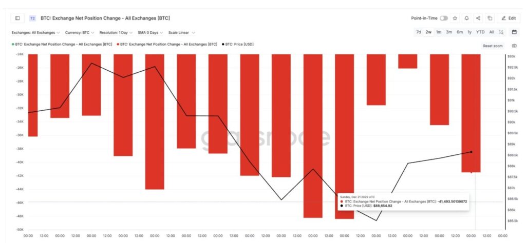 Pada 19 Desember, arus keluar Bitcoin dari bursa mencapai sekitar 26.098 BTC. Dua hari kemudian, pada 21 Desember, jumlah itu melonjak menjadi 41.493 BTC — peningkatan 59% hanya dalam dua hari.