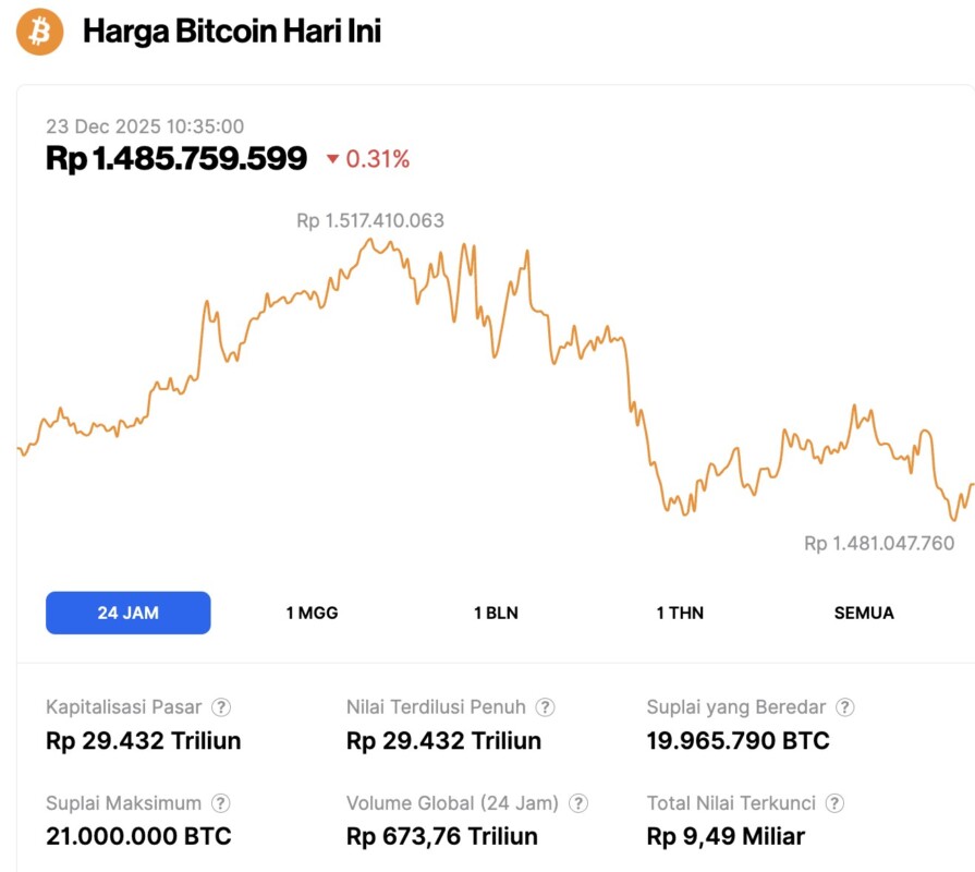 Pada 23 Desember 2025, harga Bitcoin tercatat berada di level $88,264 atau setara dengan Rp1.490.359.133, mengalami koreksi 0,31% dalam 24 jam terakhir. Sepanjang periode ini, BTC menyentuh level terendahnya di Rp1.481.047.760 dan harga tertingginya di Rp1.517.410.063.
