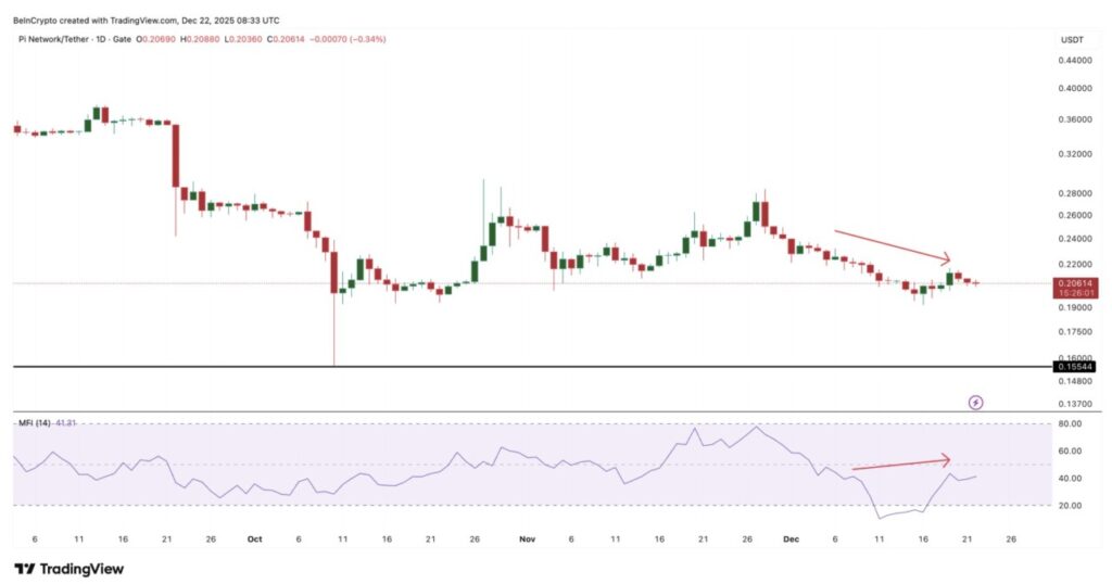 Antara 6 Desember hingga 19 Desember, harga Pi Coin cenderung menurun, sementara nilai MFI justru naik. Perbedaan arah ini menunjukkan bahwa meskipun harga melemah, tekanan beli berbasis volume justru meningkat. Dengan kata lain, penjual memang menekan harga, tetapi pembeli secara diam-diam menyerap pasokan di pasar.