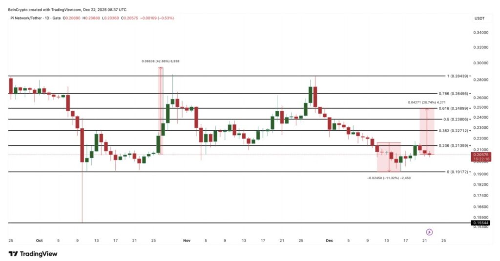 Ketika Pi Coin menembus di atas $0,21 pada 26 Oktober, harga sempat reli sekitar 42%. Namun, saat kehilangan level yang sama pada 11 Desember, harga PI turun sekitar 11%. Riwayat tersebut menjelaskan mengapa harga terus “berputar” di sekitar zona ini dan mengapa para trader PI menganggapnya sebagai area krusial.