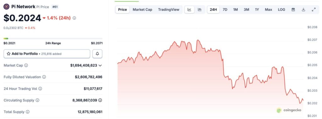 Pada 23 Desember 2025, harga Pi Network tercatat berada di angka $0,2024, mengalami penurunan 1,4% dalam waktu 24 jam. Jika dikonversikan ke dalam rupiah saat ini ($1 = Rp16.77), maka 1 Pi Network adalah Rp3.395. Berdasarkan data dari CoinGecko, harga PI sempat bergerak dalam rentang $0,2021 hingga $0,2071 dalam sehari terakhir.