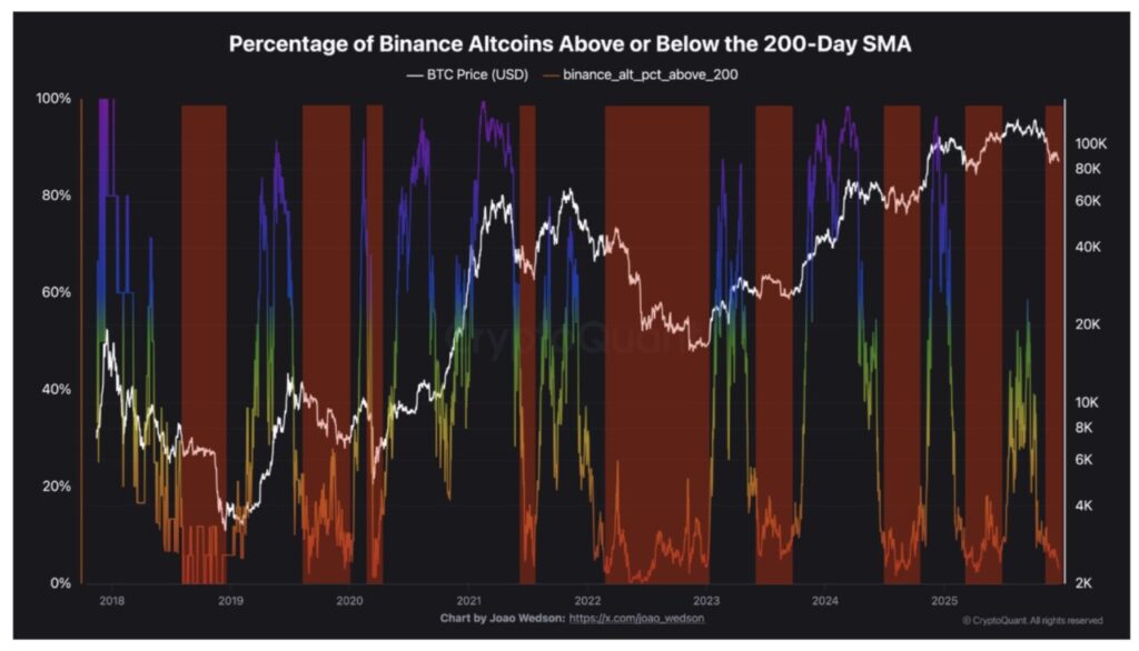 Pertama, data dari CryptoQuant menunjukkan bahwa hanya sekitar 3% altcoin di Binance yang diperdagangkan di atas rata-rata pergerakan 200 harinya. Angka ini merupakan titik terendah dalam sejarah.