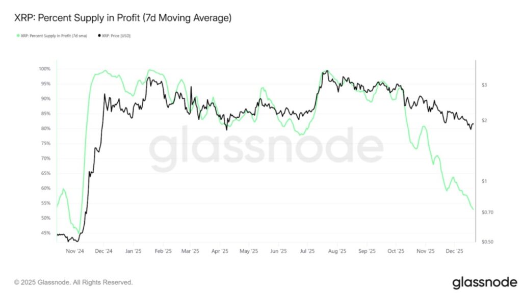 Menurut data dari Glassnode, tekanan terhadap para pemegang XRP terus meningkat. Sekitar 52% dari total suplai yang beredar saat ini berada dalam kondisi untung, yang berarti hampir setengah dari seluruh token berada dalam posisi merugi.