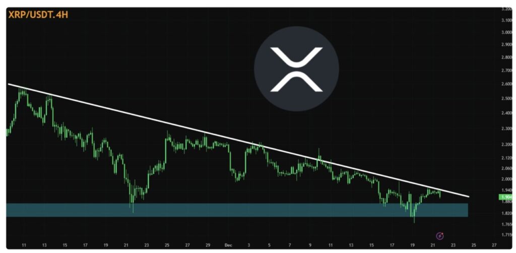 Dari sisi teknikal, XRP saat ini diperdagangkan di sekitar $1,92 dan masih tertahan di bawah level resistansi sekitar $1,94. Garis tren menurun yang telah bertahan lebih dari enam minggu terus menekan setiap upaya kenaikan harga.