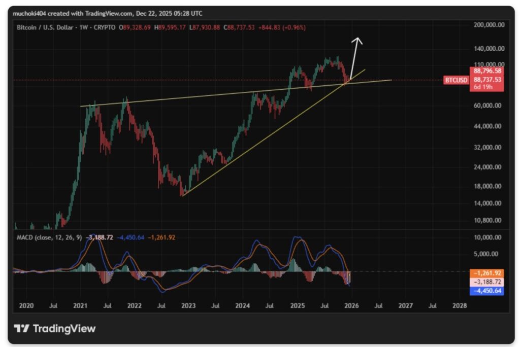 Dari sudut pandang analisis teknikal, harga Bitcoin saat ini sedang menguji level support penting pada grafik mingguan. Setelah mengalami tekanan jual kuat sejak Agustus, terdapat indikasi bahwa Bitcoin telah mencapai titik terendah (bottom) dan berpotensi memulai reli bullish baru pada kuartal pertama tahun 2026.