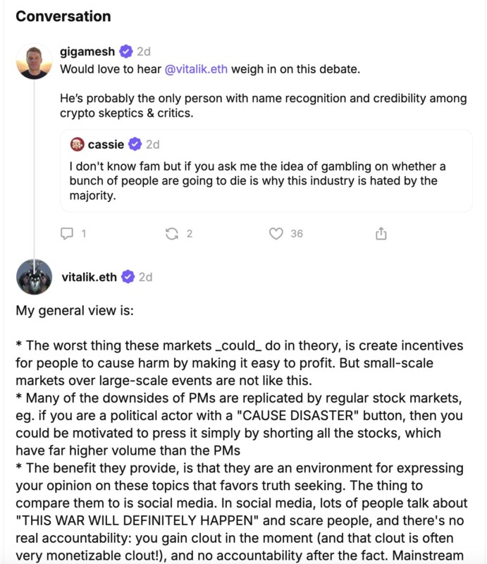 Perdebatan ini muncul setelah adanya kritik bahwa bertaruh pada peristiwa seperti perang atau kematian merupakan kegagalan moral dalam dunia kripto. Seorang pengguna Farcaster mempertanyakan apakah pasar yang memprediksi kematian telah melewati batas etika.