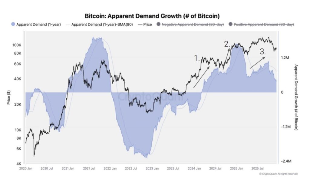 Data terbaru menunjukkan bahwa pertumbuhan permintaan kini melambat setelah beberapa gelombang peningkatan sebelumnya dalam siklus ini. Meskipun harga Bitcoin tetap tinggi sepanjang sebagian besar tahun 2025, permintaan tidak mampu mencapai puncak baru.