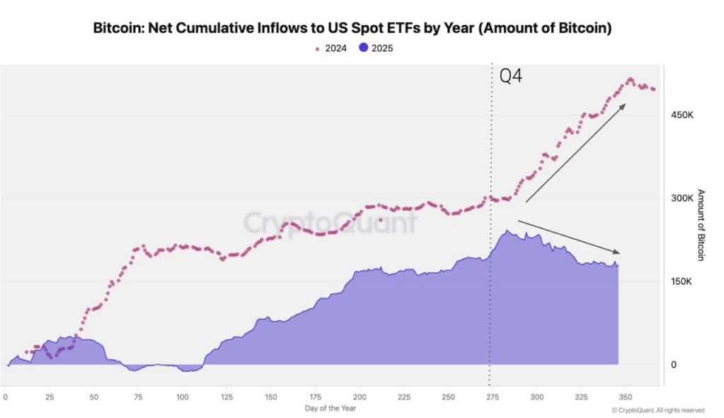 Pada tahun 2024, arus masuk ETF meningkat secara konsisten hingga akhir tahun. Namun, pada kuartal keempat 2025, arus masuk tersebut mulai mendatar dan bahkan menurun pada beberapa periode.