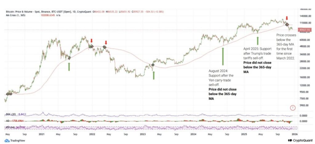 Meskipun penembusan berkelanjutan di bawah rata-rata 365 hari tidak serta-merta menandakan kejatuhan besar, hal ini menunjukkan pergeseran momentum jangka panjang dan meningkatkan kemungkinan bahwa setiap reli harga ke depan akan menghadapi resistansi yang lebih kuat.