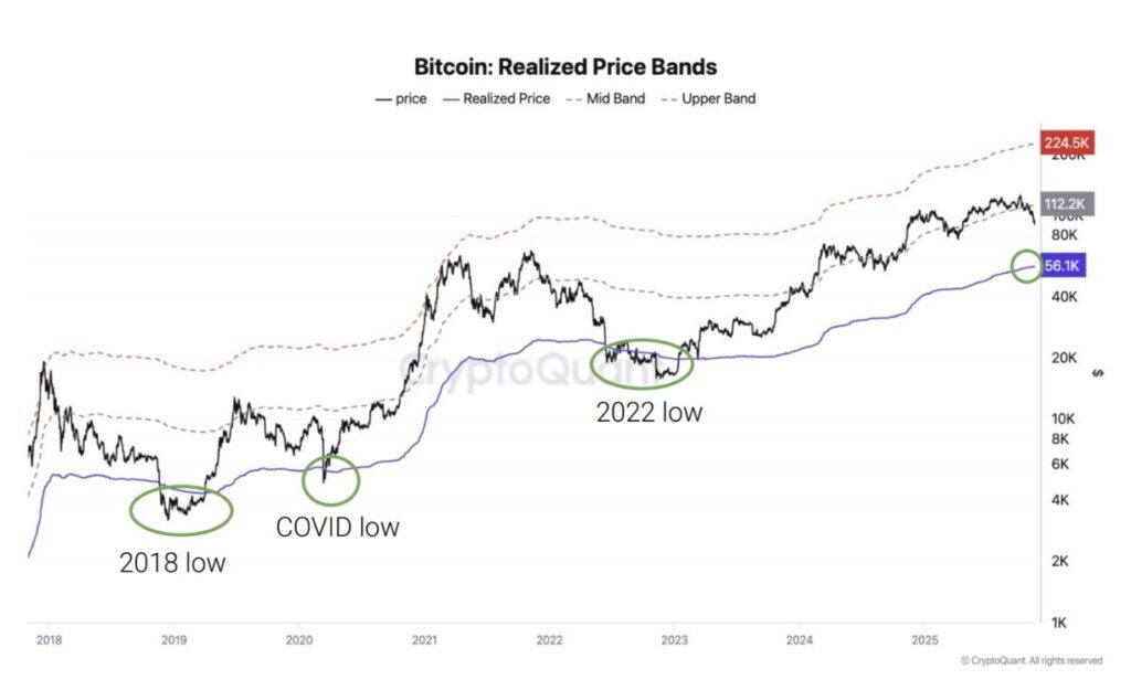 Harga terealisasi (realized price) Bitcoin, yang saat ini berada di sekitar $56.000, mencerminkan rata-rata harga beli semua pemegang BTC. Dalam bear market sebelumnya, Bitcoin sering mencapai titik terendah di sekitar atau sedikit di bawah level ini.
