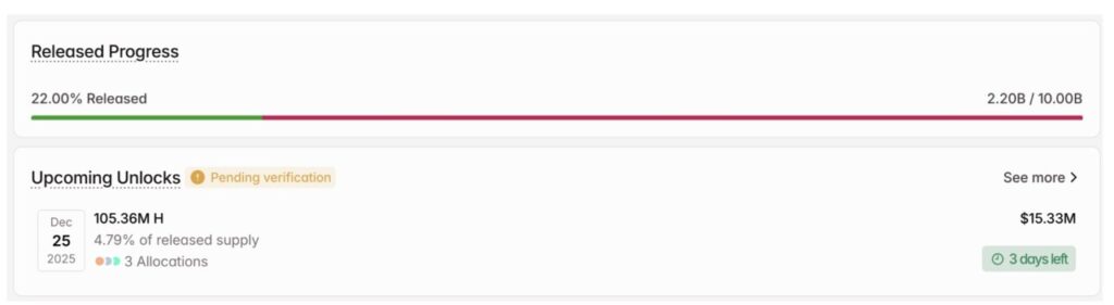 • Jumlah Token yang Akan Dirilis: 105,36 juta H (1,05% dari total pasokan)