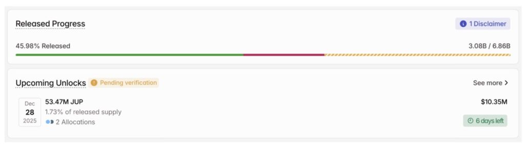 Pada 28 Desember, Jupiter akan membuka 53,47 juta token JUP sesuai dengan jadwal vesting bulanan (cliff vesting). Nilai token yang dirilis sekitar $10,35 juta, atau 1,73% dari total pasokan beredar.