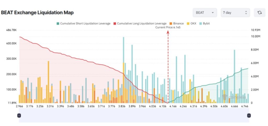 Jika harga BEAT turun di bawah $3, total likuidasi posisi Long bisa mencapai $10 juta.