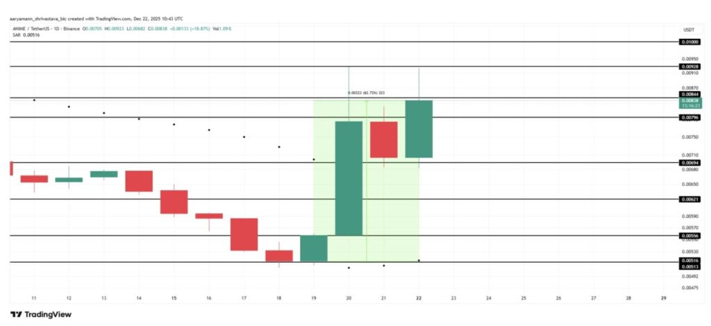 ANIME telah naik sebesar 62% dalam tujuh hari terakhir, dan saat ini diperdagangkan di sekitar $0,0083. Koin meme ini tengah menguji level resistansi di $0,0084 setelah sempat naik hingga $0,0092 dalam perdagangan harian. Momentum jangka pendek yang kuat menunjukkan meningkatnya minat investor serta aktivitas spekulatif yang lebih tinggi.