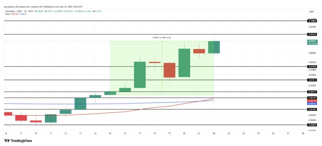 BAN mencatat kenaikan 31,4% dalam sepekan terakhir, dan kini diperdagangkan di sekitar $0,090. Minat investor yang kuat mendorong momentum naik saat koin meme ini mendekati level psikologis $0,100. Reli ini mencerminkan meningkatnya sentimen positif dan partisipasi aktif dari para trader jangka pendek.