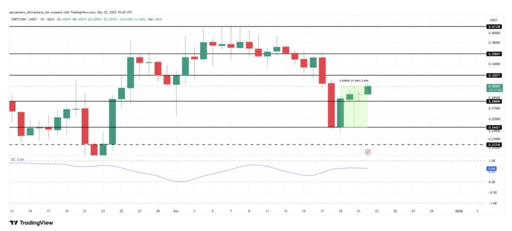 Namun, korelasi tersebut juga membawa risiko penurunan. Jika Bitcoin melemah, keuntungan FARTCOIN dapat cepat terhapus. Dalam skenario tersebut, harga bisa turun di bawah $0,280, dan penurunan lebih lanjut berpotensi menyeretnya ke sekitar $0,244, yang akan membatalkan pandangan bullish serta menimbulkan tekanan turun yang lebih luas.