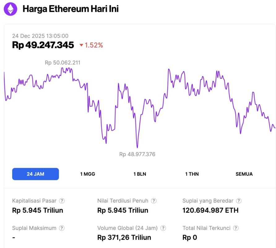 Pada 24 Desember 2025, harga Ethereum tercatat berada di sekitar $2,922 atau setara dengan Rp49.247.345, mengalami penurunan 1,52% dalam 24 jam terakhir. Sepanjang periode ini, ETH sempat menyentuh level terendahnya di Rp48.977.376 dan level tertingginya di Rp50.062.211.