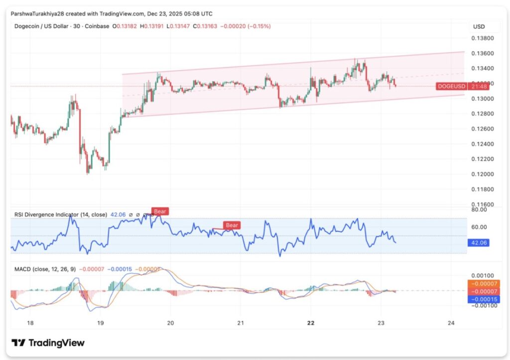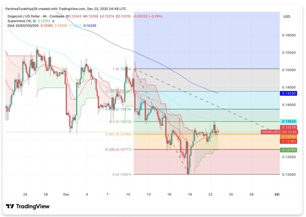 Level retracement Fibonacci yang ditarik dari puncak November hingga dasar Desember masih menjadi panduan utama perilaku harga jangka pendek. Saat ini, DOGE bergerak di sekitar level 0,382 retracement di $0,1316, yang dalam beberapa sesi terakhir menjadi titik magnet harga.