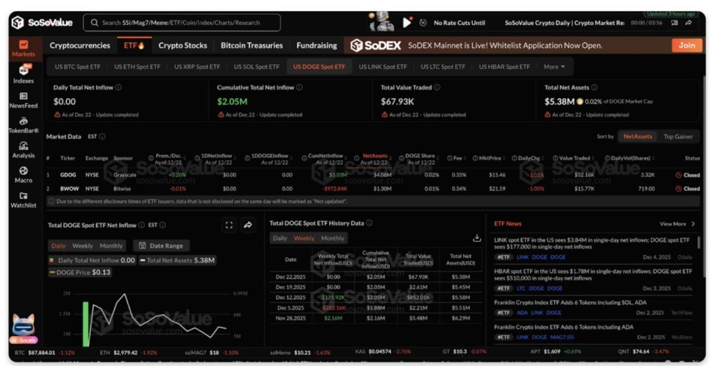 Aktivitas perdagangan dalam ETF yang terhubung dengan DOGE juga masih lesu, mencerminkan minimnya partisipasi institusional di level harga saat ini.