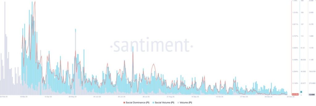 Data dari Santiment menunjukkan bahwa minat sosial terhadap Pi Network terus menurun, menandakan berkurangnya permintaan dari investor ritel. Selain itu, dominasi sosial dan volume pembicaraan tentang PI juga turun menjadi masing-masing 0,013% dan 6 pada hari Rabu, dari puncaknya 0,017% dan 24 pada 6 Desember.
