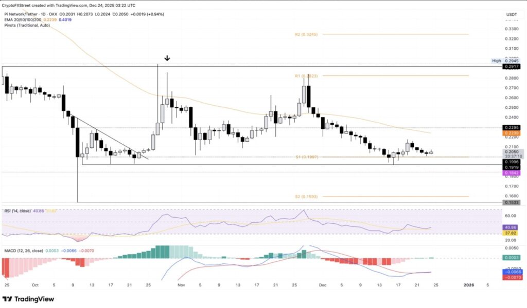 Pi Network berjuang untuk tetap berada di atas level $0,2000, meski sempat naik 1% pada Rabu saat waktu penulisan, setelah empat hari berturut-turut mencatatkan penurunan. Pemulihan intraday ini mencerminkan adanya permintaan di level psikologis tersebut dan mengisyaratkan potensi rebound dari titik pivot S1 di $0,1997.