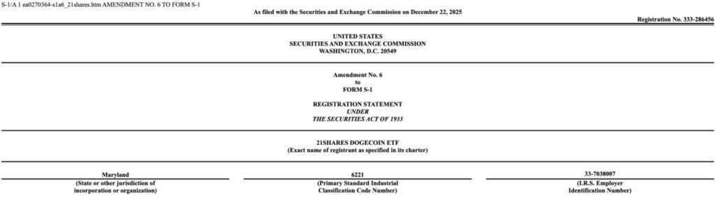 Sebuah pengajuan ke SEC (Komisi Sekuritas dan Bursa Amerika Serikat) menunjukkan bahwa penerbit ETF kripto 21Shares telah kembali melakukan perubahan terhadap dokumen pendaftaran (Form S-1) untuk produk ETF Dogecoin (DOGE) mereka. Perubahan ini merupakan amandemen keenam pada dokumen tersebut, dilakukan seiring dengan persiapan peluncuran dana ETF DOGE oleh manajer aset tersebut.