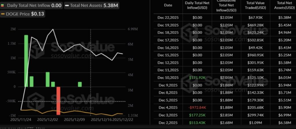 Data dari SoSo Value menunjukkan bahwa ETF Dogecoin terus mengalami kinerja yang kurang baik sejak diluncurkan pada akhir November. Dana-dana ini telah mencatat delapan hari berturut-turut tanpa arus dana masuk (zero flows) sejak 11 Desember.
