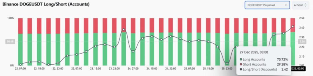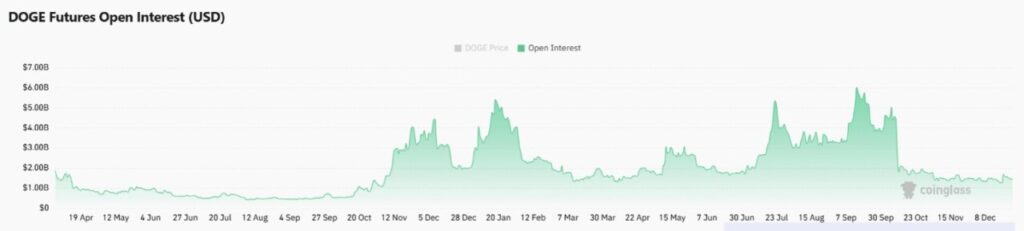 Open Interest naik menjadi sekitar $1,49 miliar, meningkat 1,6% meski harga DOGE justru turun. Perbedaan arah ini penting untuk diperhatikan.