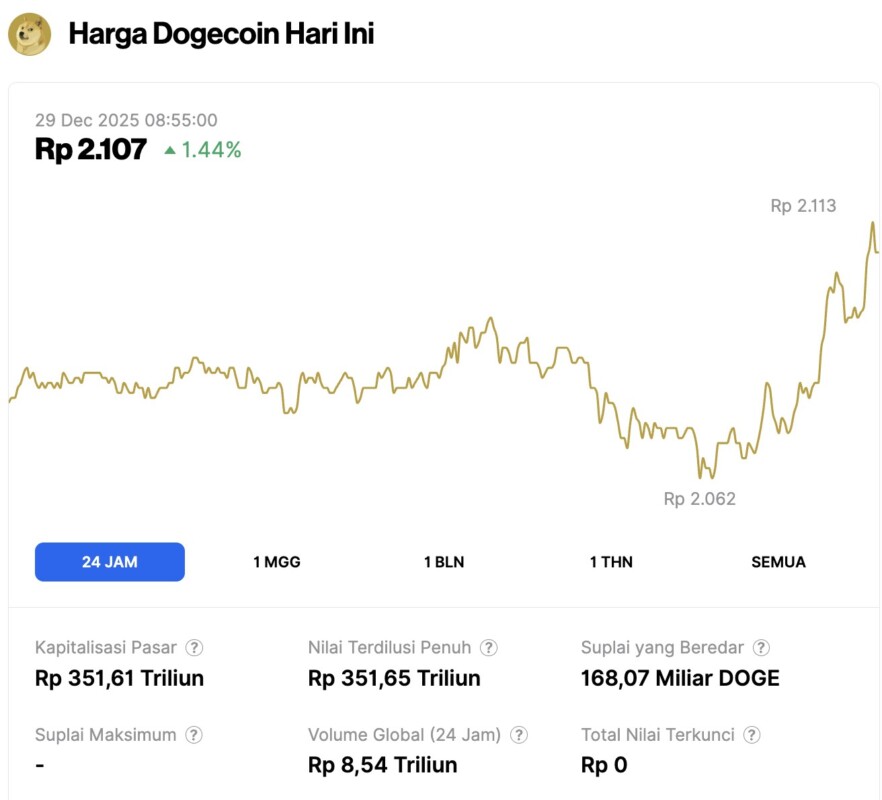 Pada 29 Desember 2025, harga Dogecoin tercatat mengalami kenaikan 1,44% dalam waktu 24 jam, diperdagangkan pada harga $0.1256 atau setara dengan Rp2.107. Dalam periode 24 jam terakhir, harga DOGE bergerak dalam kisaran Rp2.062 hingga ke Rp2.113.