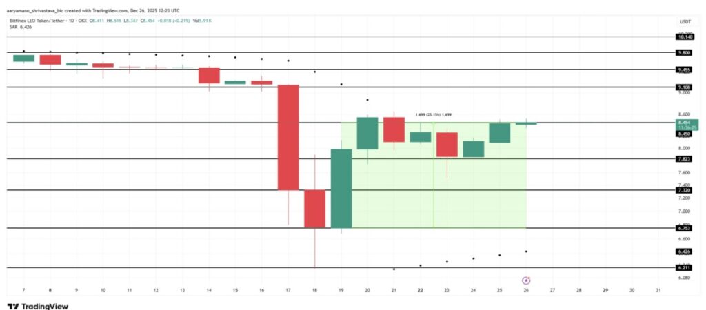 Harga LEO melonjak 25% dalam sepekan terakhir dan diperdagangkan di kisaran $8.45 saat penulisan. Secara teknikal, struktur harga menunjukkan dukungan kuat, dengan indikator Parabolic SAR mengonfirmasi tren naik yang masih aktif. Ini menandakan bahwa pembeli masih memegang kendali meskipun pasar secara umum sedang tidak pasti.
