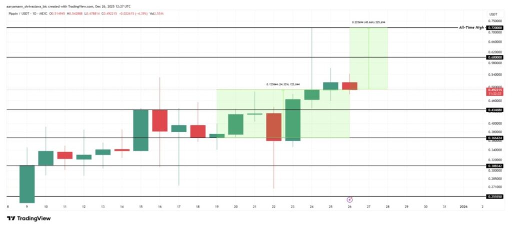 Rekor tertinggi terbaru tercatat di $0.720, dan PIPPIN perlu naik sekitar 45,6% untuk kembali ke level tersebut. Untuk mencapainya, PIPPIN harus mampu mengubah level $0.600 menjadi support yang solid. Jika zona ini berhasil dipertahankan, hal tersebut akan mengonfirmasi kekuatan tren dan meningkatkan peluang kelanjutan kenaikan harga.