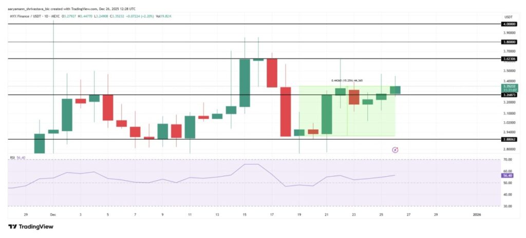 Harga MYX sempat diperdagangkan di kisaran $3.35, setelah mencatat kenaikan sebesar 15,2% dalam tujuh hari terakhir. Altcoin ini masih bertahan di atas level support $3.26. Struktur harga saat ini mengindikasikan bahwa pembeli tengah mengincar resistance di $3.62 seiring momentum yang terus tumbuh secara bertahap.
