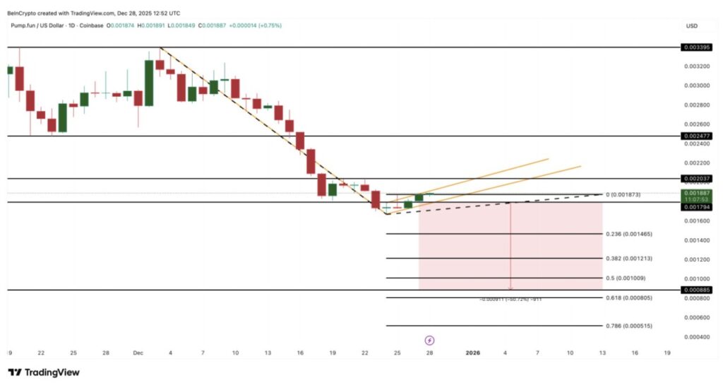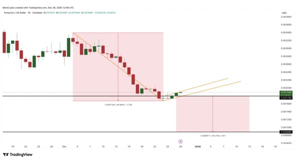 Grafik harga turut memberikan sinyal kehati-hatian. PUMP saat ini diperdagangkan di sekitar $0,00188 dan berada dalam pola teknikal yang menyerupai bear flag. Jika harga turun menembus $0,00179, maka potensi penurunan lanjutan bisa membawa harga ke $0,00146, lalu $0,00100, dan bahkan bisa mencapai $0,00088 apabila momentum benar-benar melemah.