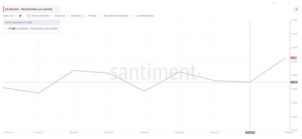 Para whale yang memegang 10 juta hingga 100 juta DOGE mulai kembali melakukan akumulasi. Jumlah kepemilikan mereka naik dari 17,38 miliar menjadi 17,50 miliar DOGE pada 27 Desember.