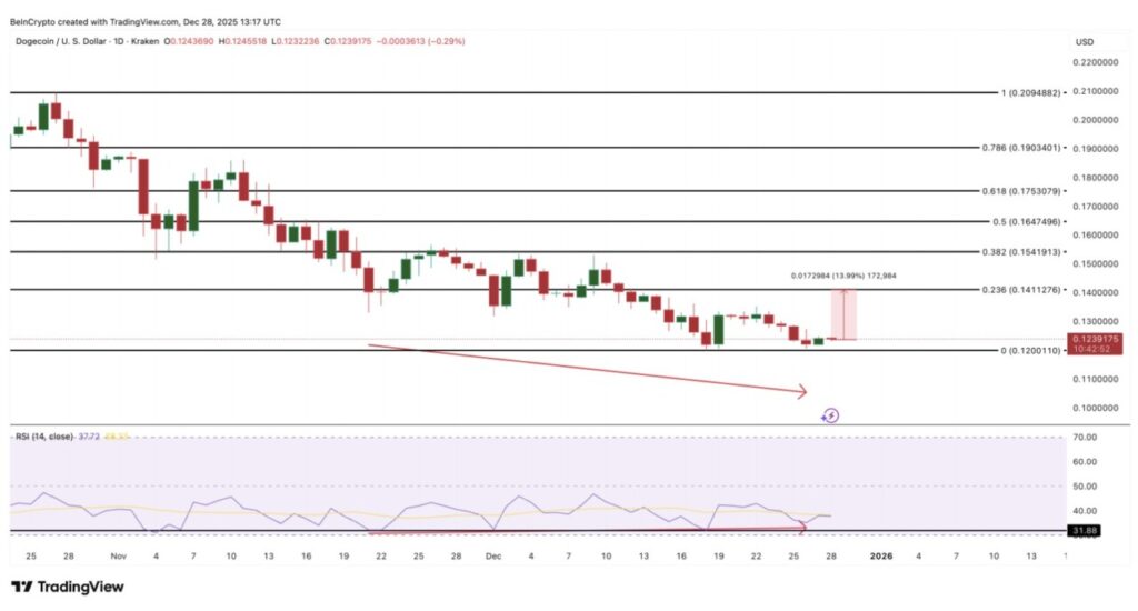 Grafik harga DOGE mendukung skenario ini. Antara 21 November hingga 26 Desember, DOGE mencetak lower low, sementara indikator RSI (Relative Strength Index) justru membentuk higher low.
