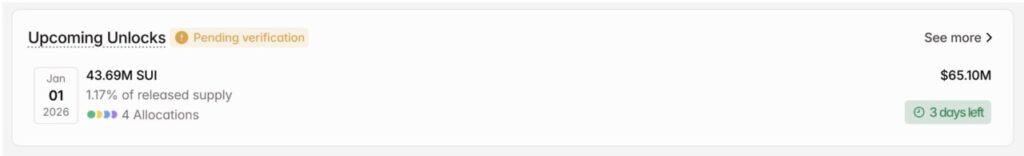 Pada tanggal 1 Januari, Sui akan membuka 43,69 juta token SUI sebagai bagian dari jadwal vesting bulanan yang sedang berjalan. Jumlah ini mewakili 1,17% dari suplai yang sudah beredar, dengan nilai sekitar $65,10 juta.