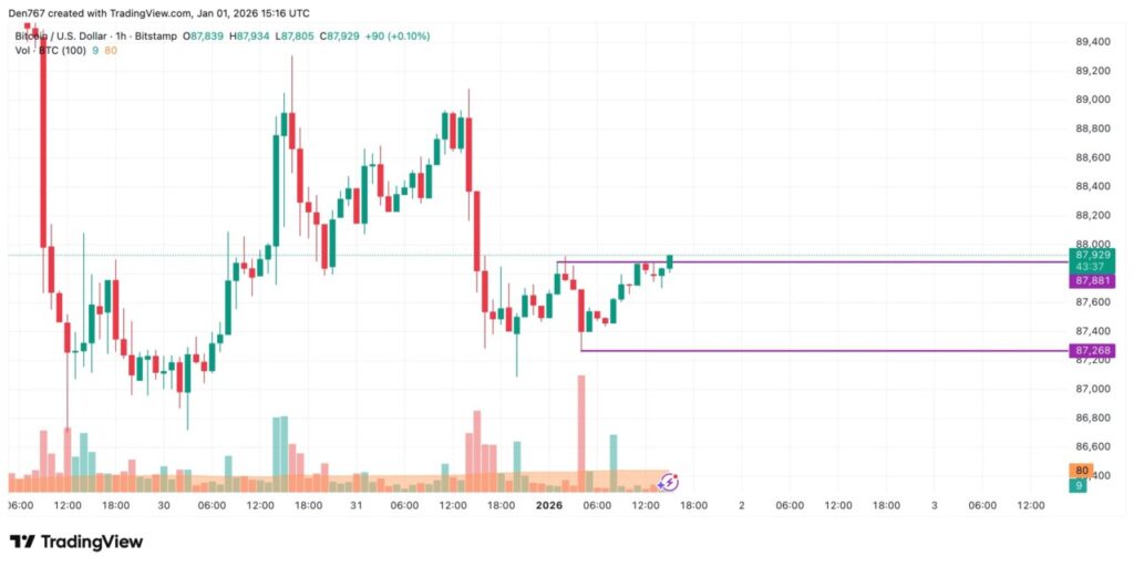 Analisis teknikal menunjukkan bahwa harga Bitcoin berusaha menembus resistance lokal di level sekitar USD 87.881. Jika pembeli dapat mempertahankan momentum di atas titik ini, potensi kenaikan menuju level resistance berikutnya di sekitar USD 88.500 dapat terjadi. Laporan ini menyebutkan bahwa level tersebut merupakan zona psikologis penting di grafik jangka pendek.