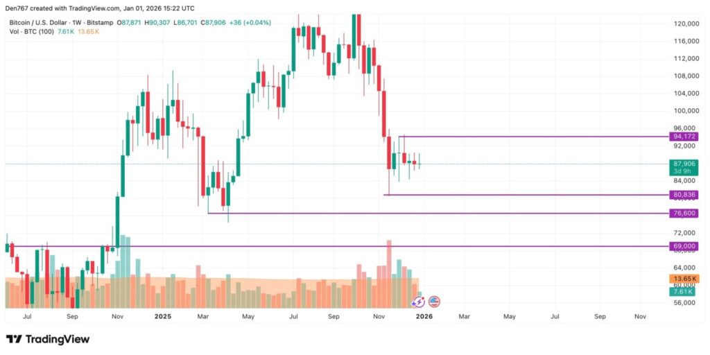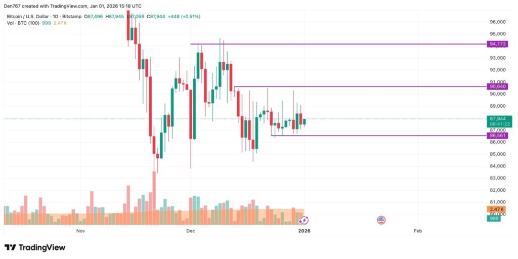 Meskipun mengalami penurunan, Bitcoin tetap berada dalam rentang harga yang relatif stabil karena volume perdagangan yang rendah. Kondisi seperti ini umum terjadi pada akhir periode liburan dan pergantian tahun, ketika trader menunggu katalis signifikan. Data ini menunjukkan bahwa volatilitas dalam jangka pendek masih terbatas pada periode awal 2026.