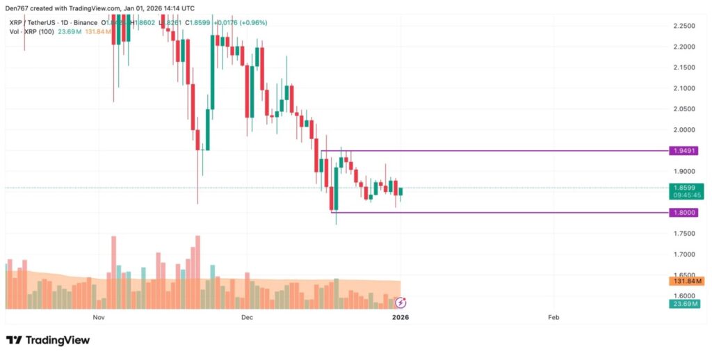 Data harga historis menunjukkan bahwa XRP bergerak dalam kisaran sempit antara support sekitar USD 1,82 hingga resistance di sekitar USD 1,88 pada awal 2026. Rentang sempit ini menunjukkan fase sideways yang kuat dalam pasar crypto untuk XRP pada periode tersebut.