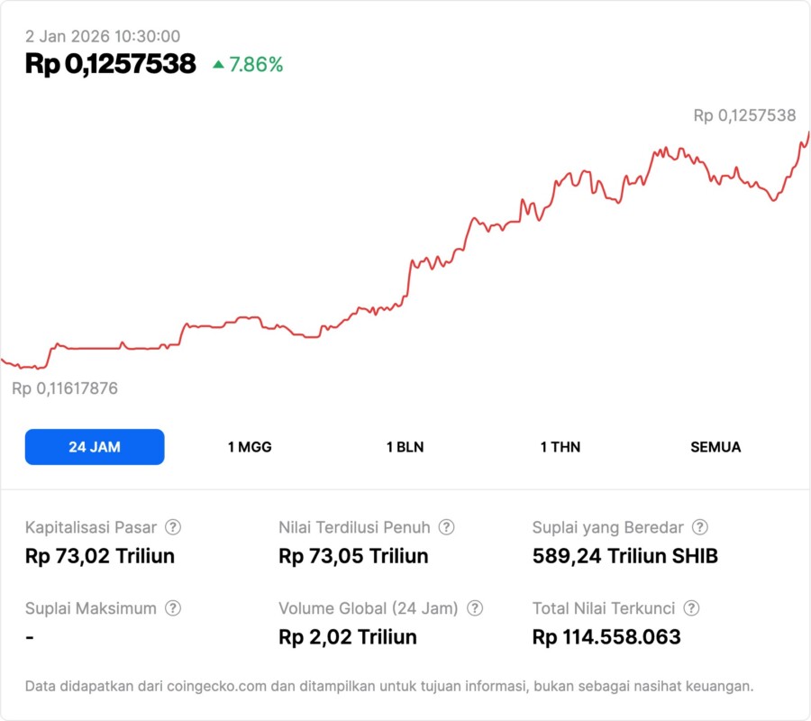 Volume perdagangan SHIB juga naik sekitar 20,34 persen dalam 24 jam, yang menunjukkan aktivitas pasar yang lebih tinggi; tetapi harga yang relatif stabil mencerminkan bahwa pasar masih menunggu arah tren yang lebih jelas.