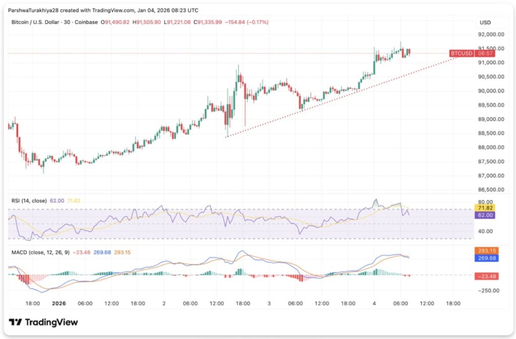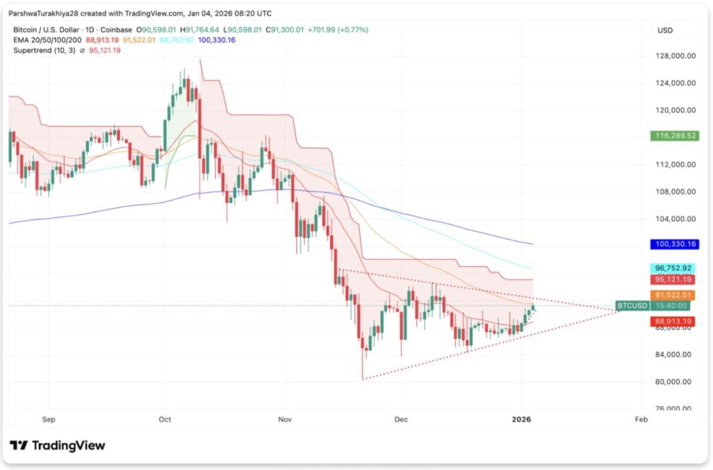 Jakarta, Pintu News – Harga Bitcoin sempat diperdagangkan di sekitar $91.300 saat pasar memasuki tanggal 5 Januari dengan pergerakan yang semakin menyempit. Pembeli mempertahankan garis tren jangka pendek yang naik, sementara penjual terus menahan kenaikan harga di bawah garis resistensi menurun yang telah membentuk pola pergerakan harga sejak November.