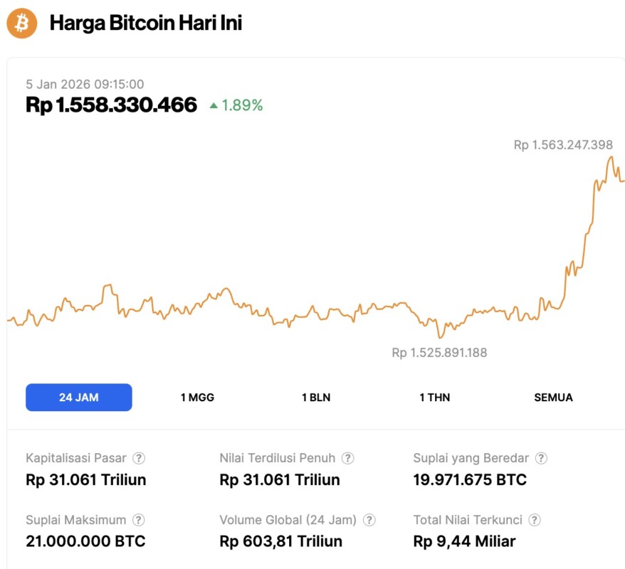 Pada 5 Januari 2026, harga Bitcoin tercatat berada di level $92,877 atau setara dengan Rp1.558.330.466, mengalami kenaikan 1,89% dalam 24 jam terakhir. Sepanjang periode ini, BTC menyentuh level terendahnya di Rp1.525.891.188 dan harga tertingginya di Rp1.563.247.398.