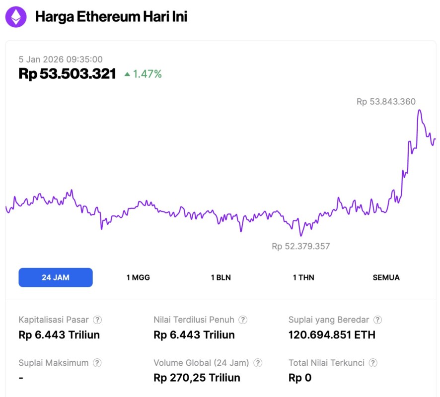 Pada 5 Januari 2026, harga Ethereum tercatat berada di sekitar $3,188 atau setara dengan Rp53.503.321, mengalami kenaikan 1,47% dalam 24 jam terakhir. Sepanjang periode ini, ETH sempat menyentuh level terendahnya di Rp52.379.357 dan level tertingginya di Rp53.843.360.