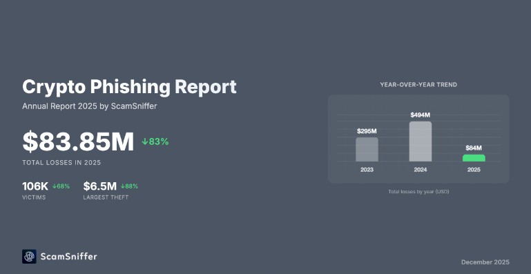 Kerugian yang disebabkan oleh serangan phishing di pasar crypto pada 2025 turun tajam menjadi sekitar USD83,85 juta, setara dengan sekitar Rp1,4 triliun berdasarkan kurs 1 USD = Rp16.708. Angka ini mencerminkan penurunan sekitar 83 persen dibandingkan periode 2024 yang mencapai hampir USD494 juta. Data ini diambil dari laporan analisis tahunan oleh platform keamanan blockchain Scam Sniffer.