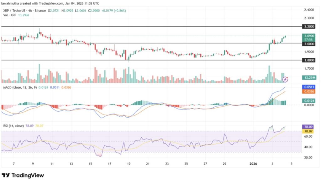 Bitcoin, Ethereum, dan XRP sama-sama melanjutkan tren positif, dengan Ripple mencatat kenaikan 2,74% pada 4 Januari 2026. Ini membuat pertumbuhan mingguannya mencapai 10%, didukung oleh indikator teknikal yang menunjukkan peningkatan permintaan.