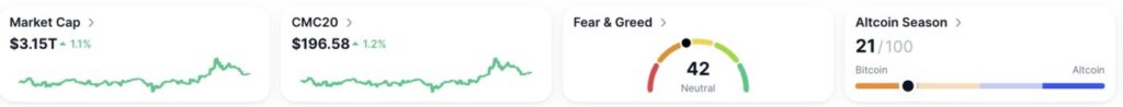 Meski demikian, indikator Fear & Greed Index berada di angka 42, yang mencerminkan sentimen netral dari para pelaku pasar — tidak terlalu optimis, namun juga tidak menunjukkan ketakutan ekstrem.