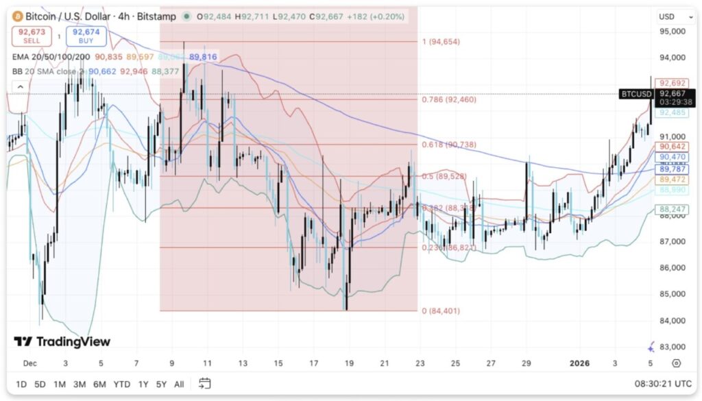 Jakarta, Pintu News – Bitcoin melanjutkan tren pemulihannya pada awal Januari 2026, seiring para pembeli mempertahankan level harga yang lebih tinggi pada grafik empat jam (5/1). Data pasar menunjukkan bahwa BTC masih mempertahankan struktur bullish jangka pendek setelah pulih dari pelemahan di akhir Desember.