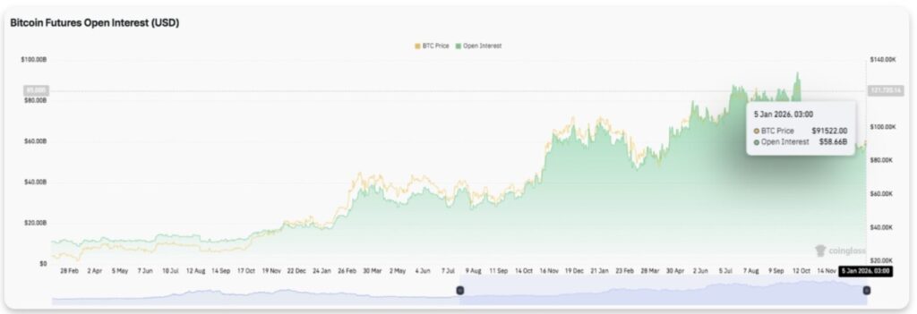 Data dari pasar derivatif menunjukkan bahwa open interest (OI) pada kontrak futures Bitcoin meningkat seiring dengan kenaikan harga. Kenaikan open interest ini terjadi secara konsisten hingga awal tahun 2026, mencerminkan partisipasi trader yang makin bertambah. Yang penting, kenaikannya berlangsung secara teratur, bukan secara ekstrem atau tiba-tiba.