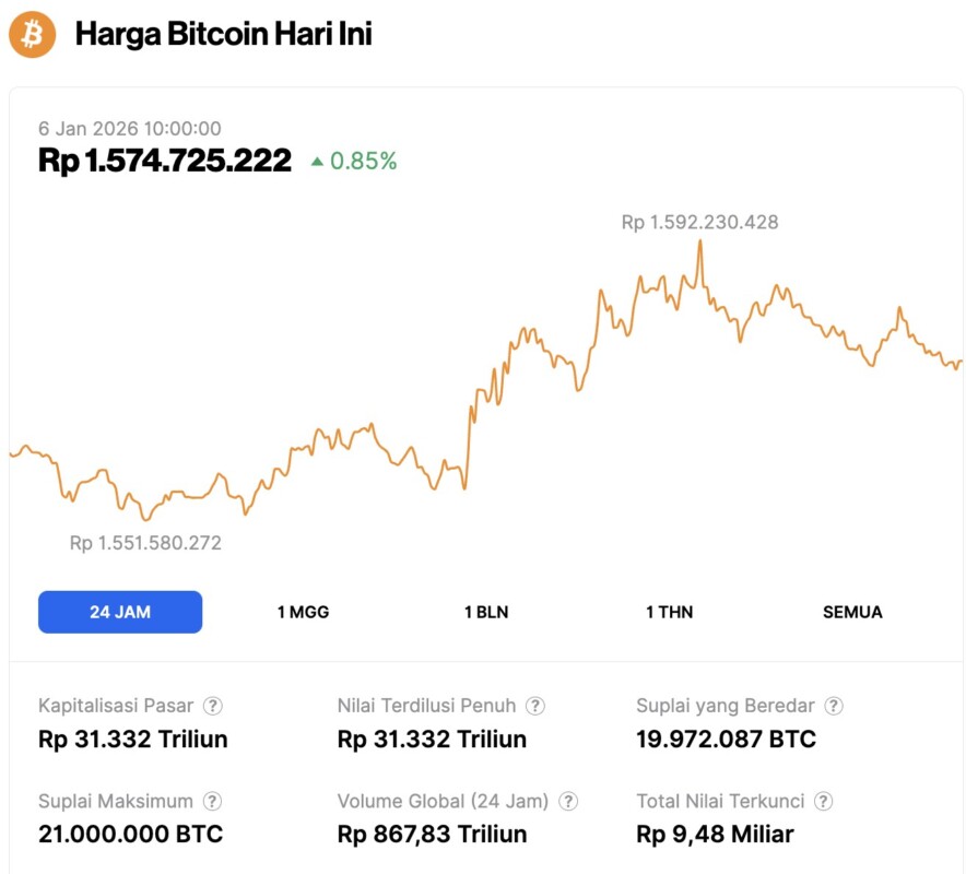 Pada 6 Januari 2026, harga Bitcoin tercatat berada di level $93,716 atau setara dengan Rp1.574.725.222, mengalami kenaikan 0,85% dalam 24 jam terakhir. Sepanjang periode ini, BTC menyentuh level terendahnya di Rp1.551.580.272 dan harga tertingginya di Rp1.592.230.428.