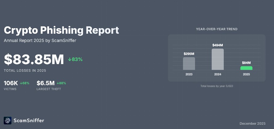 Jakarta, Pintu News – Kerugian akibat serangan phishing di dunia kripto mengalami penurunan signifikan sebesar 83% pada tahun 2025, turun menjadi sekitar $84 juta dari hampir $494 juta pada tahun sebelumnya. Meskipun terjadi penurunan yang mencolok, laporan tahunan dari firma keamanan Web3, Scam Sniffer, mengungkapkan bahwa penurunan ini menyembunyikan kenyataan yang lebih gelap tentang adanya pelaku yang lebih canggih.